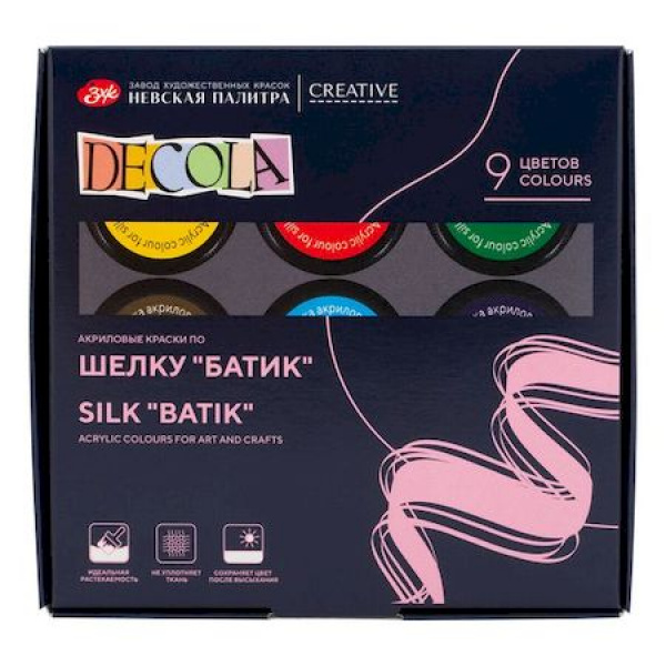 Акриловые краски по шелку «Decola» на основе водной акриловой дисперсии предназначены для росписи х/б и шелковых тканей методом холодного батика или свободной росписи. При росписи синтетических тканей рекомендуется убедиться в прочности закрепления рисунка на образце ткани в соответствии с инструкцией по применению. Ткань предварительно выстирайте, выгладите, натяните на раму или пяльцы. По методу холодного батика нанесите по контуру рисунка резерв по шелку смываемый для предотвращения смешивания красок. Просушите до полного высыхания (1-1,5 ч). Краску тщательно перемешайте и нанесите на изделие кистью, просушите 24 ч. При свободной росписи резерв не применяется. Готовое изделие прогладьте 5 мин через х/б ткань утюгом, нагретым до температуры для хлопка. Через 48 ч после проглаживания резерв удалите с шелка, постирав изделие мягкими моющими средствами при температуре от 30?С до 40?С без сильного механического воздействия. Храните краски в плотно закрытой таре. Кисти и инструменты сразу после работы промойте водой. При попадании на кожу смойте водой.