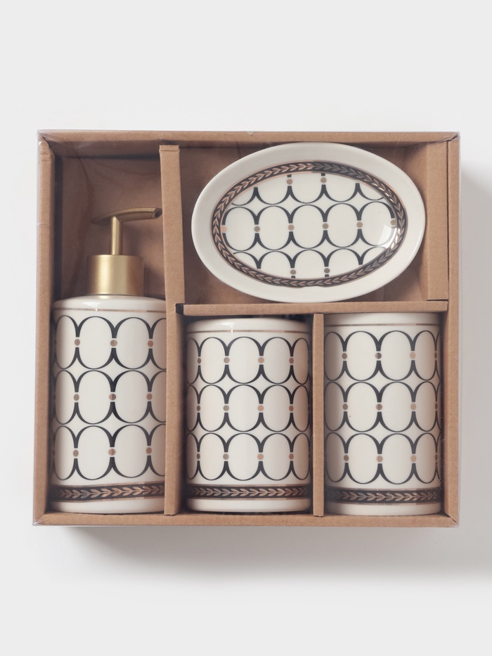 Страна: Китай В боксе: 24 набор Состав: Керамика, пластик Материалы: керамика, пластик Фасовка: по 1 набор Индивидуальная упаковка: Транспортировочная упак-а Сертификат: Не подлежит сертификации Набор: Да Цвет: Белый В наборе, шт.: 4 Тематика: Узоры Рисунок: Да Материал: Керамика Тип: Настольная Настенные: Нет Фиксированная цена: Да Ванную комнату мы посещаем несколько раз в день. Поэтому хочется, чтобы она была уютной, стильной и заряжала по утрам бодростью и хорошим настроением. Секрет её удачного оформления — яркие аксессуары! Набор аксессуаров организует пространство и станет стильным украшением Вашей ванной комнаты. За счет сдержанного дизайна данный керамический набор в ванную подойдет к любому дизайну ванной комнаты. Набор состоит из 4 предметов: 2 стакана, мыльница, дозатор. Преимущества: