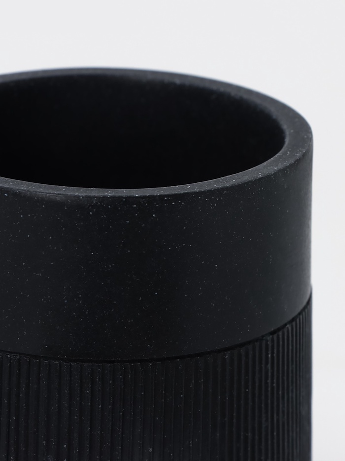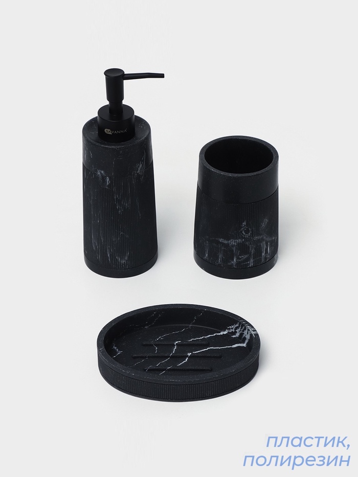 — В комплект входят три предмета: дозатор, стакан и мыльница, которые выполнены в чёрном цвете и украшены узорами.
