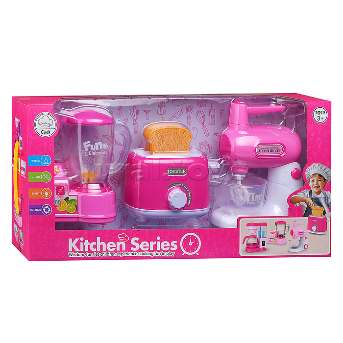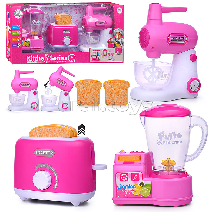 Код: 487077 Штрихкод: 6904111512770 Страна производитель: Китай Размеры упаковки: 53 x 11 x 25 см Количество в коробке: 12 • В наборе: - блендер (14х8х17 см.) - миксер (16х9.5х20 см.) - тостер (16х9х10 см.) - 2 хлебца (7.5х2х7.5 см.) • Функции блендера: вращение винта, свет индикатора, звук работы, можно наливать воду. • Функции миксера: вращение лопасти, подсветка, звук работы. • Функции тостера: можно зарядить тосты, которые выпрыгнут по истечении таймера. • Блендер работает от 3-х батареек "АА" (не входят в комплект) • Миксер работает от 2-х батареек "АА" (не входят в комплект) • Материал: пластик. • Соответствует требованиям безопасности продукции. • Для детей от 3-х лет. Комментарии к товару