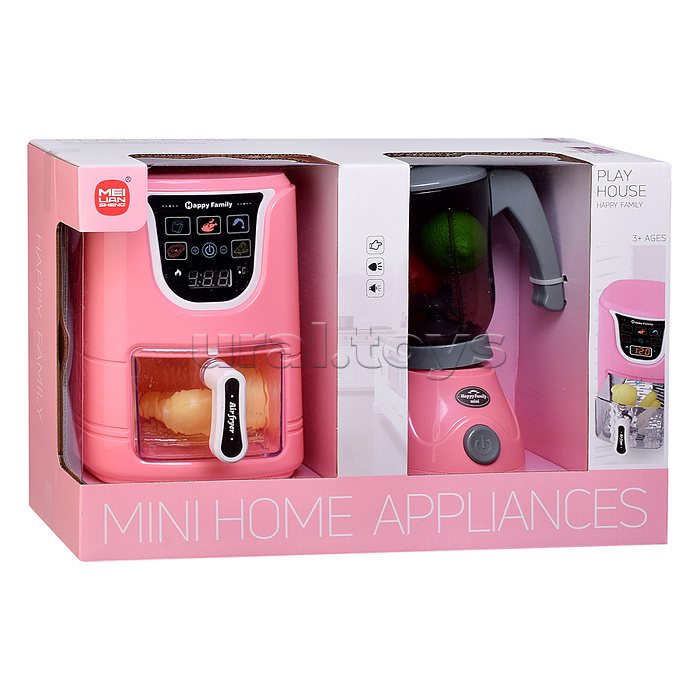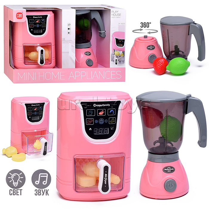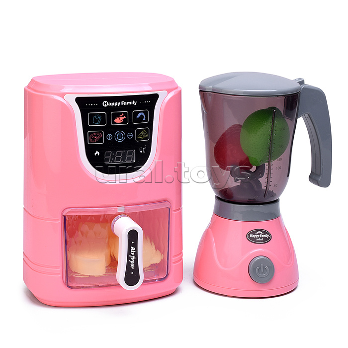 В наборе: - миксер 15*9*17 см. - аэрогриль 14*11*19,5 см. Функции миксера: при нажатии кнопки на корпусе вращается венчик, звук работающей техники. Функции аэрогриля: цифровой таймер, звук работы. Миксер работает от 2-х батареек типа "АА" ( не входят в комплект) Аэрогриль работает от 3-х батареек "АА" (не входят в комплект) Соответствует требованиям безопасности продукции. Изготовлено из полимерных материалов, пластика. Для детей от 3 лет.