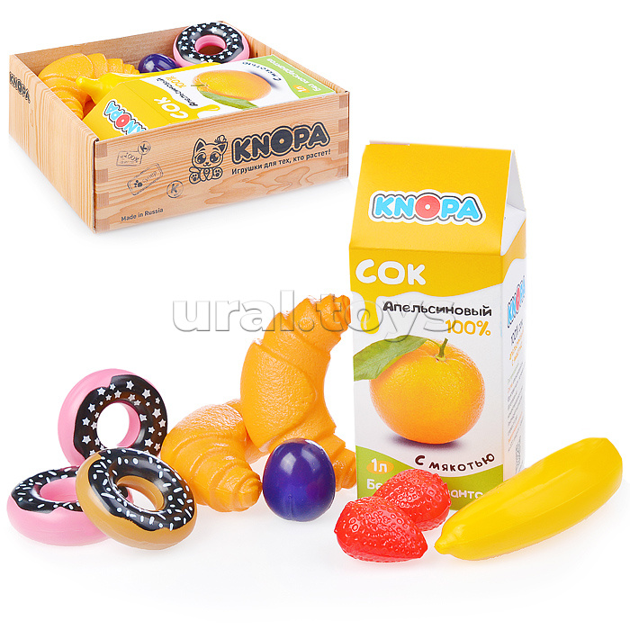 • В игровой набор входит: банан - 1 шт., клубника - 2 шт., слива - 1 шт., пончик - 3 шт., круассан - 2 шт., коробка "сок" - 1 шт. • Предназначен для сюжетно-ролевой игры дома и в детском саду. • Предметы имеют сходство с настоящими - поэтому дети получат удовольствие от игры с ними. • После игры удобно всё сложить в коробочку (20 х 15 х 7см.) и убрать на полку. • Материал: пластмасса, картон. • Соответствует требованиям безопасности продукции. • Для детей от 3-х лет.