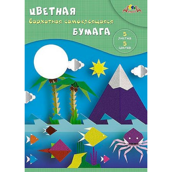 Цветная бархатная самоклеящаяся бумага, 5 листов, 5 цветов, формат А4, плотность 240 гр/м2. Внутренний блок - бархатная бумага с клеевым слоем. В наборе цвета: красный, синий, зеленый, черный, желтый. Упаковка - папка из мелованного картона с двумя клапанами. Рекомендуется детям от 3 лет.