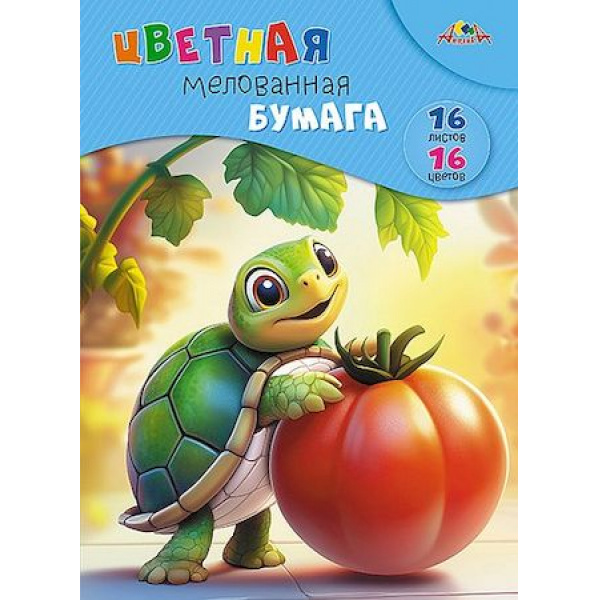 Цветная мелованная бумага, 16 листов, 16 цветов, формат А4 (200х275мм), плотность 65 гр/м2. Внутренний блок - мелованная бумага двойного прокраса, что дает насыщенность цвета. В наборе цвета: красный, желтый, синий, черный, светло красный, фиолетовый, зеленый, коричневый, малиновый, голубой, горчичный, темно-синий, фуксия, фисташковый, темно-коричневый, оранжевый. Крепление - скоба, обложка - мелованная бумага. Рекомендуется детям от 3 лет.