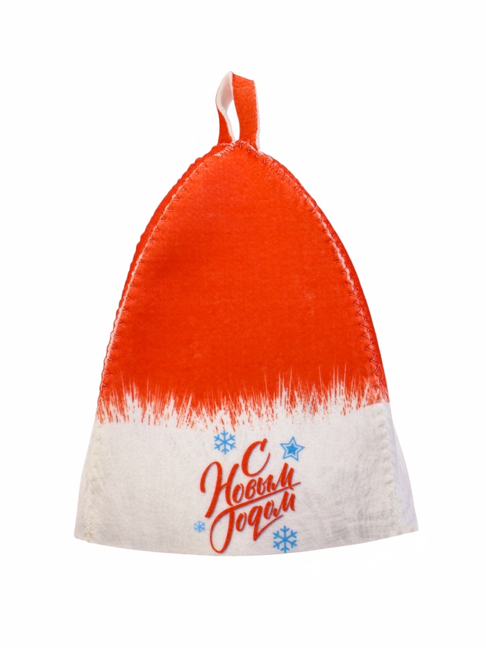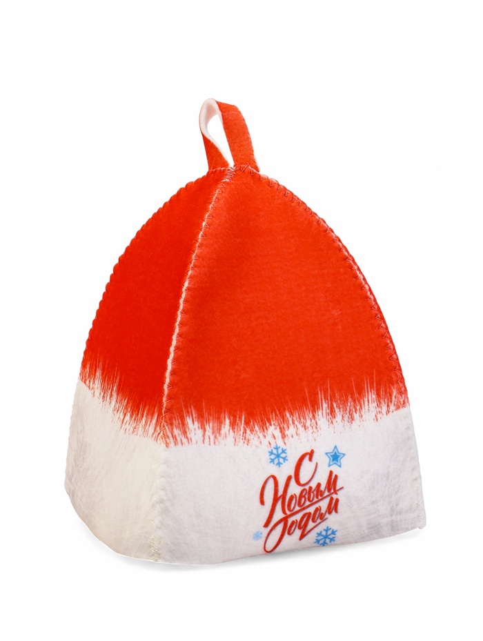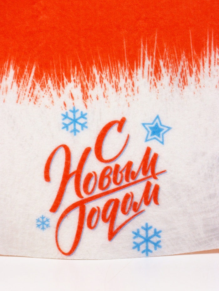 Банный набор с новогодним принтом «С новым годом!» — готовый комплект из пяти предметов для посещения парной. Все аксессуары выполнены в красном цвете и украшены праздничными надписями.