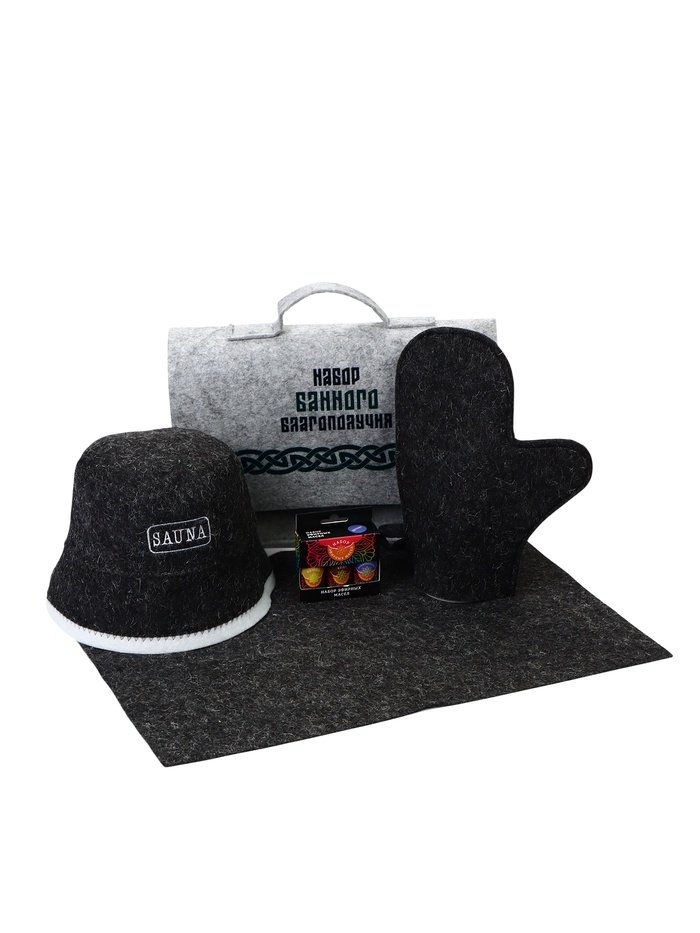 Банный комплект «Набор банного благополучия» — готовый набор аксессуаров для бани и сауны. Внутри — шапка, рукавица, коврик и эфирные масла, упакованные в портфель для хранения и переноски. Подходит для регулярных посещений бани и домашней сауны.