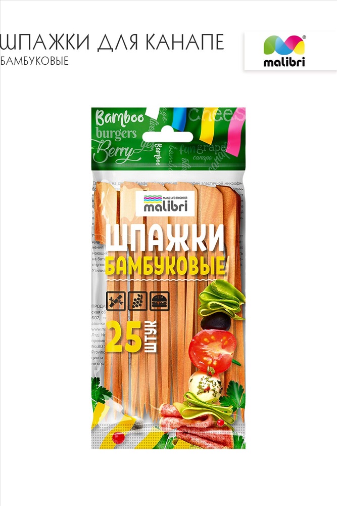 ID товара: 912420 Состав: Бамбук Сезон: Весна/Лето Основная ткань: Бамбук Страна бренда: Россия Страна производства: Россия Шпажки для канапе Malibri бамбуковые предназначены для сервировки стола и порционной подачи блюд. С их помощью можно украсить любое торжественное мероприятие. Бамбуковые шпажки подходят для оформления любых закусок, в том числе мясных, рыбных, овощных, фруктовых и т.д.. Шпажки для канапе Malibri изготовлены из экологичного и безопасного материала - бамбука. Для одноразоваого использования. Экологически безопасны! 1. Изготовлены из бамбукового волокна. Упругие, эластичные, отлично гнутся и, в то же время, прочные. 2. Благодаря особенностям бамбукового волокна, шпажки не поддаются гниению. 3. Шпажки без заусенцев и сколов - уменьшают риски возникновения травм в ротовой полости. Комментарии к товару