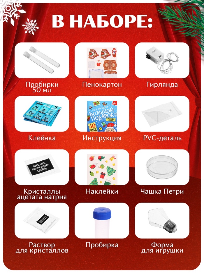 С набором для опытов «Большой новогодний подарок» — то, что нужно для полезного и интересного досуга! Такой подарок поможет ребёнку скрасить ожидание Нового года, а также позволит провести целых 40 увлекательных опытов!