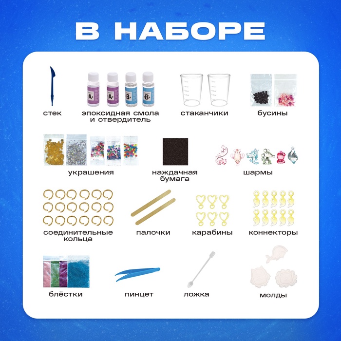 В этом наборе есть всё, чтобы своими руками сделать оригинальные брелочки из эпоксидной смолы и самого разного декора.