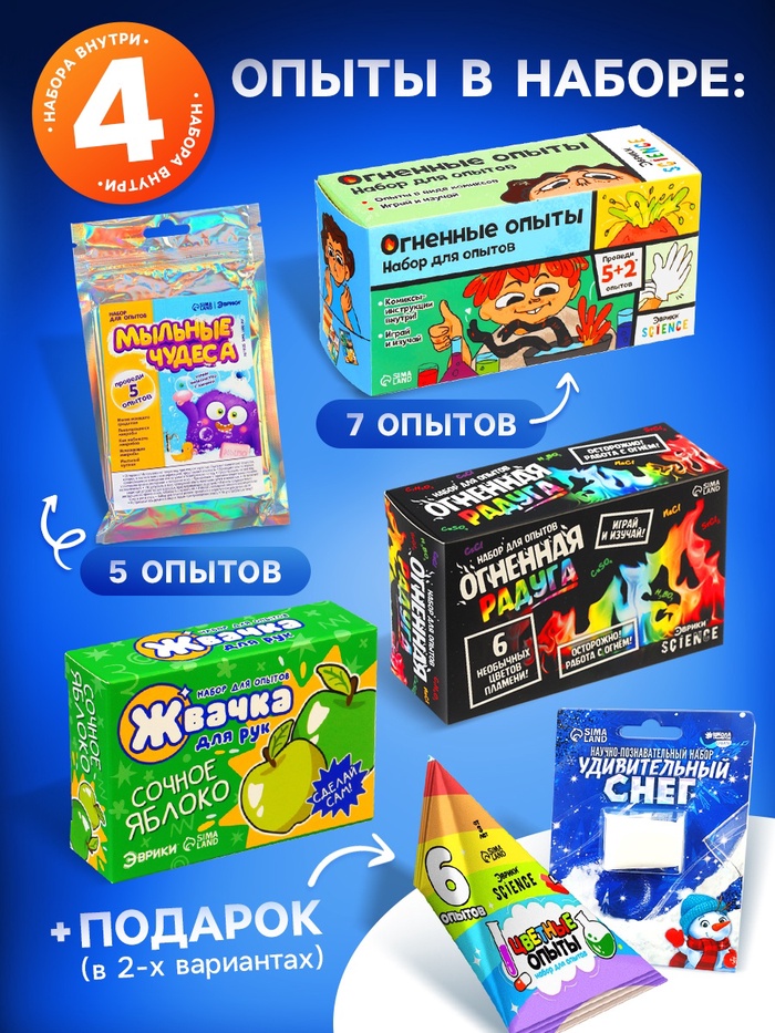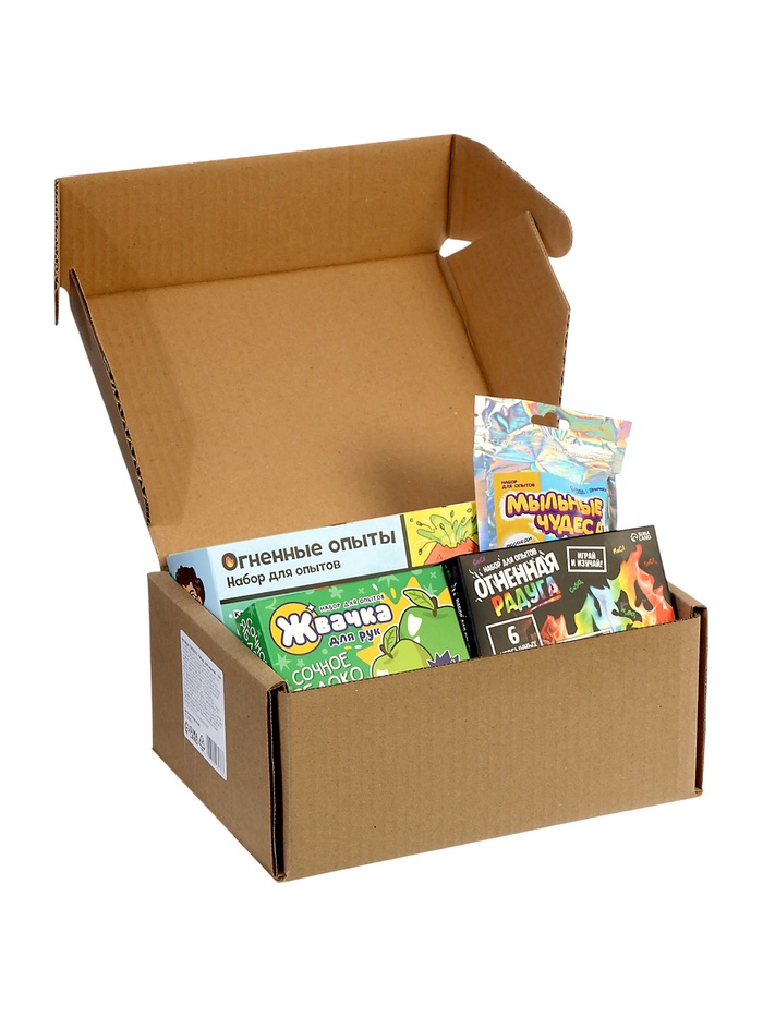 КомплектацияОбщее количество экспериментов в боксе — 15. Каждый набор содержит всё необходимое для проведения опытов: реагенты, расходники и понятные пошаговые инструкции. Что входит в набор