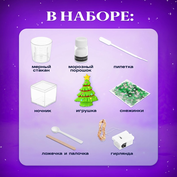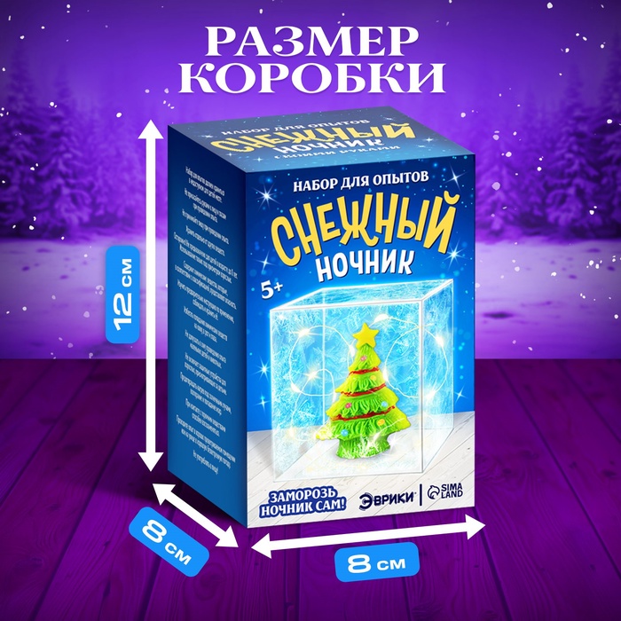 Габариты: 8 x 8 x 12 Страна: Китай В боксе: 126 шт Состав: Пластик, реагент Материалы: пластик, реагент Фасовка: по 1 шт Индивидуальная упаковка: Цветная коробка Габариты товара: 8 см × 12 см × 8 см Сертификат: ЕАС Для кого: Унисекс Форма: Квадратная Возраст: От 5 лет Количество опытов: 1 Символ года: Нет Тематика праздника: Новый год Материал: Пластик Для создания: Ночники Составляющие набора: Гирлянда Тематика набора: Опыты Вид науки: Химия Вид исследований: Опыты с реагентами Набор для опытов «Снежный ночник: Ёлочка» — то, что нужно для полезного и интересного досуга! Такой подарок поможет ребёнку скрасить ожидание Нового года, а также позволит самостоятельно провести увлекательный опыт и создать новогоднюю игрушку. Как сделать ночник