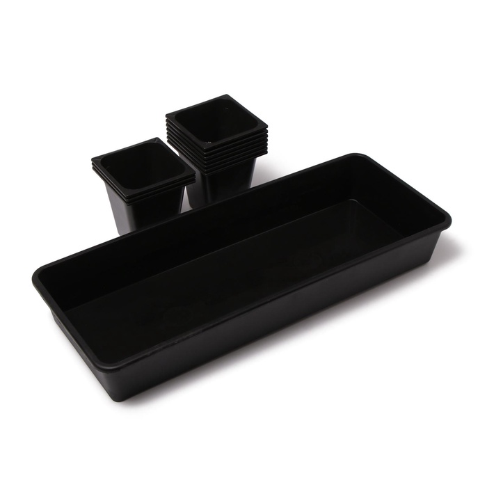 - Пластиковый поддон 61×23 см: собирает излишки воды после полива и защищает поверхности от влаги. Поддон упрощает одновременное перемещение всех стаканов.