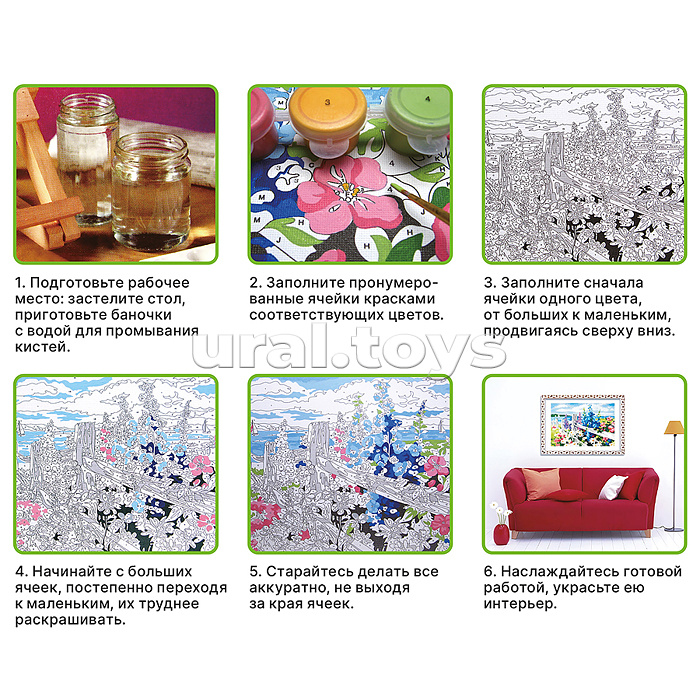 В наборе: - холст на деревянном подрамнике (30 х 20 см.) - кисти. - краски. - контрольный лист. - крепление на стену. Соответствует требованиям безопасности продукции. Для детей от 12 лет.