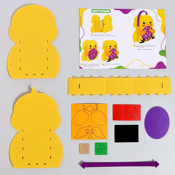 Габариты: 33 x 22 x 0,5 Страна: Китай В боксе: 100 набор Состав: Бумага, металл, текстиль Материалы: бумага, металл, текстиль Фасовка: по 10 набор Индивидуальная упаковка: Пакет Габариты товара: 32,5 см × 21,5 см × 0,5 см Сертификат: Не подлежит сертификации Для кого: Унисекс Возраст: От 3 лет Тематика: Пасхальная Символ года: Нет Тематика праздника: Пасха Материал: Фетр Возраст: Для детей Детям нравится создавать поделки из самых невероятных материалов. Оригинальный набор для создания фетровой корзиночки по-настоящему увлечёт ребёнка и станет удачным подарком для талантливого малыша! Теперь вам не нужно вырезать детали вручную, просто отделите защитную пленку и приклейте их на нужное место. Чем полезно? Набор развивает мелкую моторику ручек малыша, координацию движений, тренирует усидчивость, аккуратность, внимательность, помогает формировать зрительное восприятие и художественный вкус. В комплект входят: