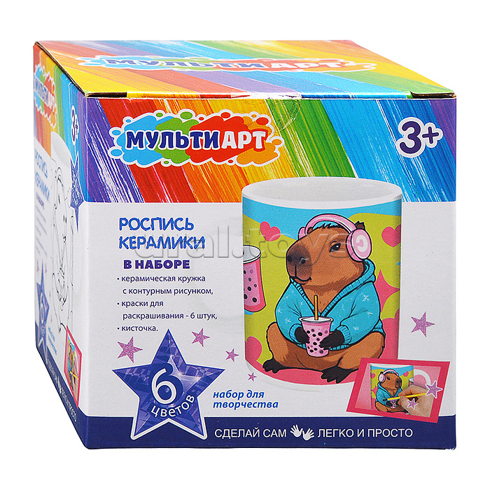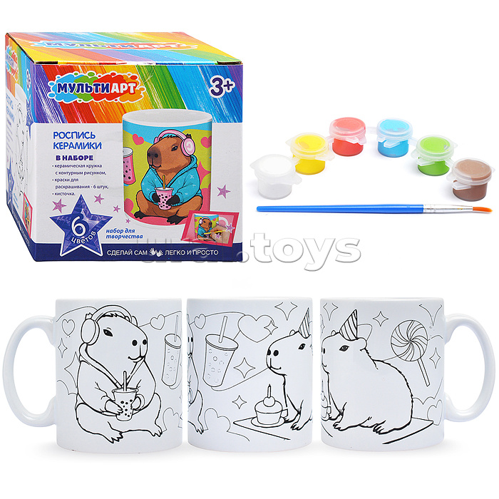 Код: 490074 Штрихкод: 4630395028608 Страна производитель: Китай Размеры упаковки: 11 x 11 x 10 см Количество в коробке: 24 В наборе: - керамическая кружка с контурным рисунком. - краски для раскрашивания. - кисточка. Соответствует требованиям безопасности продукции. Возраст: от 3-х лет. Комментарии к товару