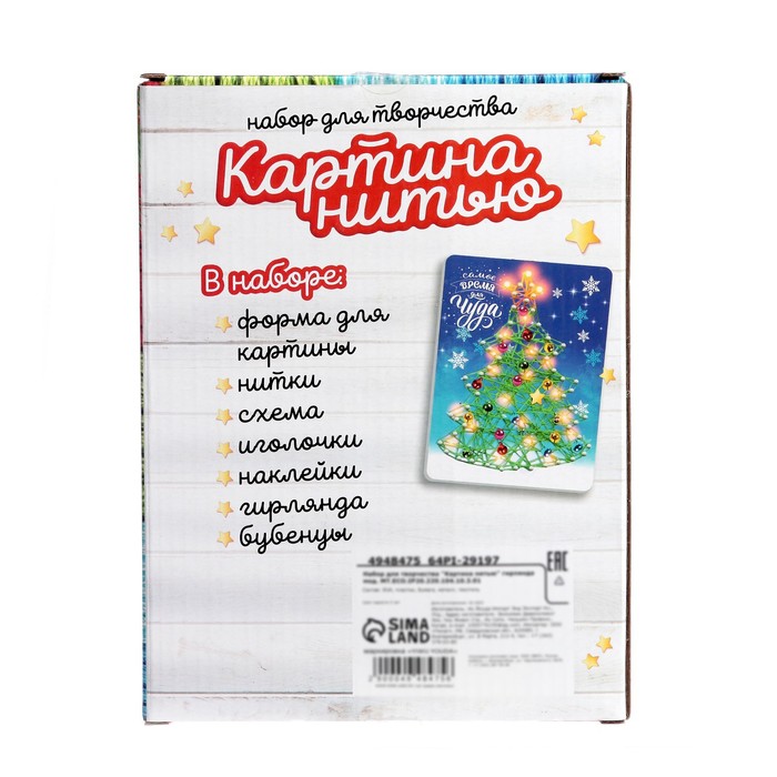 Габариты: 22 x 16 x 4 Страна: Китай В боксе: 56 набор Состав: EVA, бумага, металл, пластик, текстиль Материалы: EVA, бумага, металл, пластик, текстиль Фасовка: по 1 набор Индивидуальная упаковка: Цветная картонная коробка Сертификат: ЕАС Для кого: Унисекс Возраст: От 3 лет Символ года: Нет Тематика праздника: Новый год Адресат: Без адресата Возраст: Детский Материал для аппликации: ЭВА Для создания: Набор для декорирования Составляющие набора: Гирлянда, Аппликации Наборы для творчества в технике стринг-арт — это современный способ декора поверхности. Он заключается в натягивании нитей вокруг гвоздей или иголок по определённой схеме. В результате чего получается интересный рисунок. В наборе представлен вариант техники стринг-арт для детей. Чтобы собрать всё точно, ребёнку обязательно потребуется помощь взрослого. В комплекте есть: