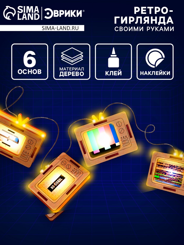 - Шесть мини-телевизоров: Каждый элемент гирлянды выполнен в виде ретро-экрана, создавая эффект ностальгического дизайна. Готовая композиция станет стильным акцентом в интерьере или на празднике.