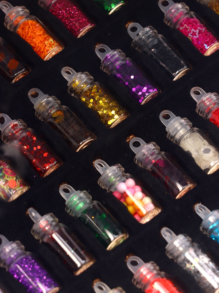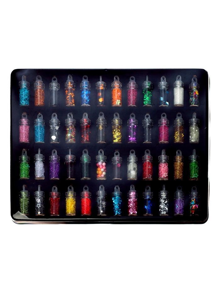 Размер подложки с декором: 19 × 14 × 1,5. Размер баночек с блёстками: 1 × 1 × 3 см.
