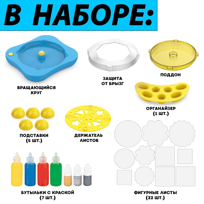 Погрузитесь в мир творчества с набором для создания картин из брызг. Этот комплект позволит вашему ребёнку создавать уникальные произведения искусства, развивая воображение и навыки работы с цветом.