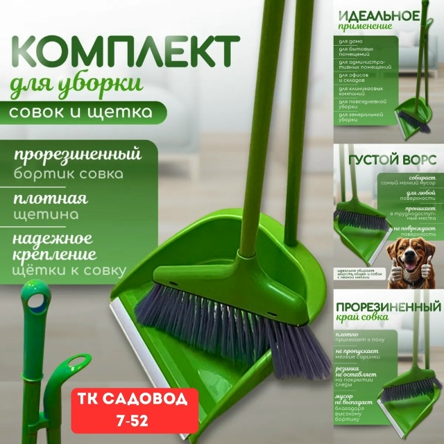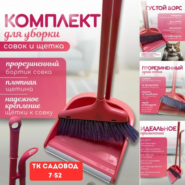 В комплект входят щётка размером h73 × 27 см и совок размером 25х24х9см.