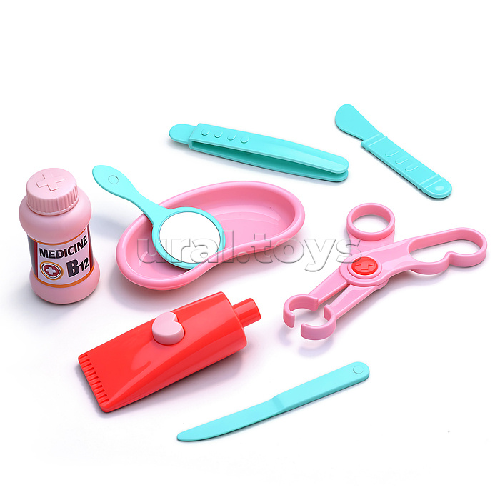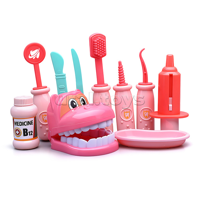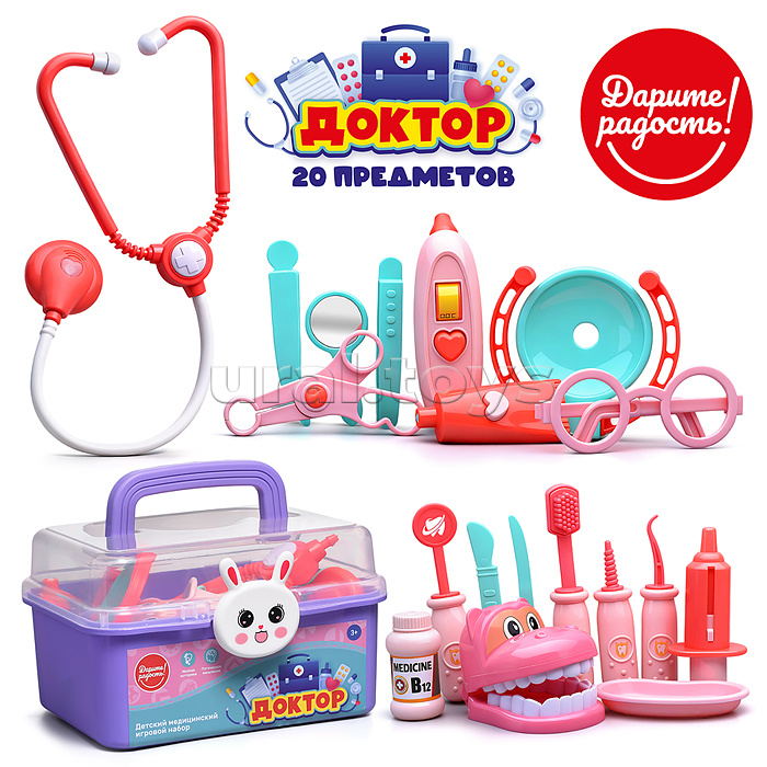• В наборе: - чемодан (21х15х12.5 см.) - челюсть бигемота (7х9х6.5 см.) - шприц с пружинкой (10.5х5 см.) - стетоскоп с пищалкой. - аксессуары (15 предметов) • Материал: пластик. • Соответствует требованиям безопасности и качества продукции. • Для детей от 3-х лет.