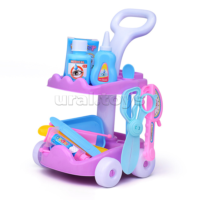 Код: 486568 Штрихкод: 4630432203296 Страна производитель: Китай Размеры упаковки: 32 x 24 x 7 см Количество в коробке: 60 • В наборе: - тележка (15.5х14.5х24 см.) - фонендоскоп (без механизмов) - аксессуары (14 предметов) • Материал: пластик. • Соответствует требованиям безопасности продукции. • Для детей от 3-х лет. Комментарии к товару