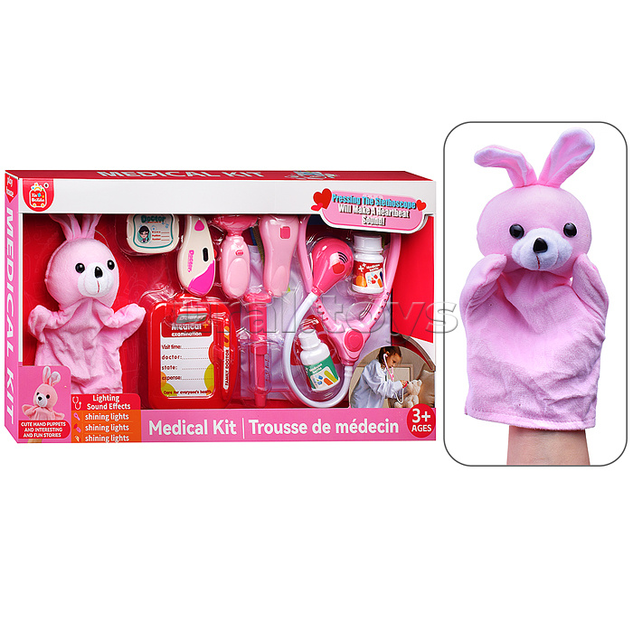• В наборе: - игрушка-перчатка (16х7х19 см.) - шприц с пружинкой (12х4 см.) - отоскоп с подсветкой (10х5 см.) - термометр с подсветкой (10х4.5 см.) - стетоскоп (звук биения сердца, подсветка) - аксессуары. • Отоскоп работает от 2-х батареек "AG10" (входят в комплект) • Термометр работает от 2-х батареек "AG10" (входят в комплект) • Стетоскоп работает от 2-х батареек "AG10" (входят в комплект) • Материалы: пластик, текстиль. • Соответствует требованиям безопасности и качества продукции. • Для детей от 3-х лет.