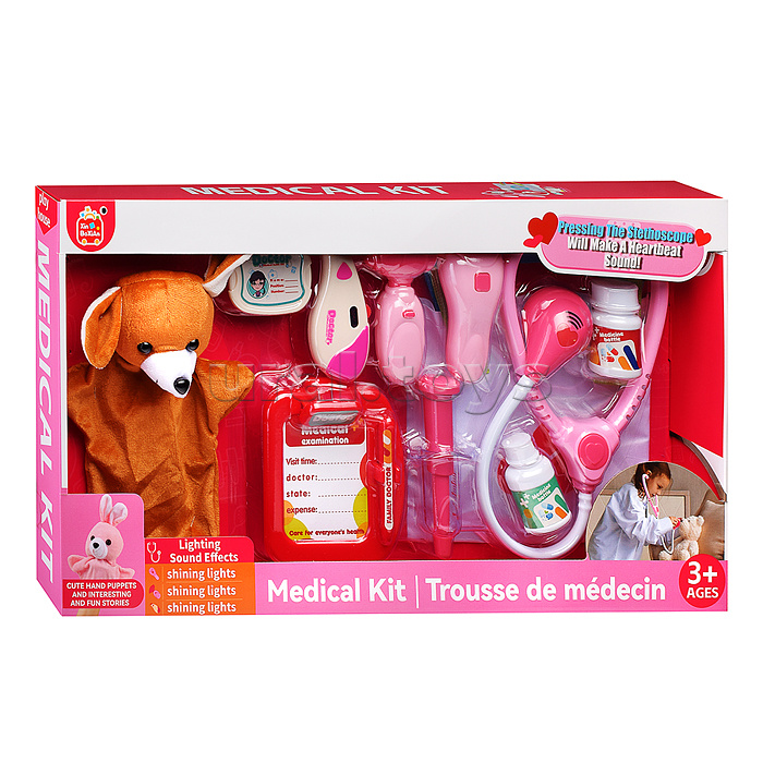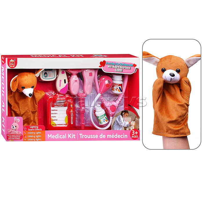 • В наборе: - игрушка-перчатка (16х7х19 см.) - шприц с пружинкой (12х4 см.) - отоскоп с подсветкой (10х5 см.) - термометр с подсветкой (10х4.5 см.) - стетоскоп (звук биения сердца, подсветка) - аксессуары. • Отоскоп работает от 2-х батареек "AG10" (входят в комплект) • Термометр работает от 2-х батареек "AG10" (входят в комплект) • Стетоскоп работает от 2-х батареек "AG10" (входят в комплект) • Материалы: пластик, текстиль. • Соответствует требованиям безопасности и качества продукции. • Для детей от 3-х лет.
