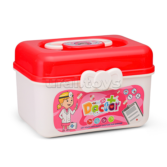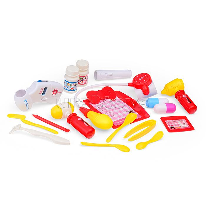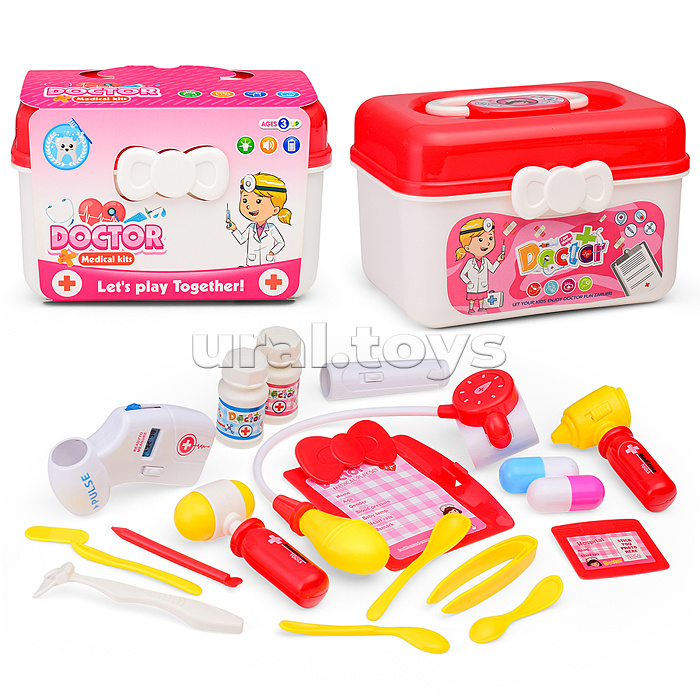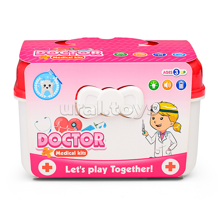 • В наборе: - чемодан (22х15х14.5 см.) - отоскоп с подсветкой. - фонарик. - термометр с подсветкой. - аксессуары (15 предметов) • Отоскоп работает от 2-х батареек "LR1130" (входят в комплект) • Термометр работает от 2-х батареек "LR1130" (входят в комплект) • Фонарик работает от 2-х батареек "LR1130" (входят в комплект) • Материал: пластик. • Соответствует требованиям безопасности продукции. • Для детей от 3-х лет.