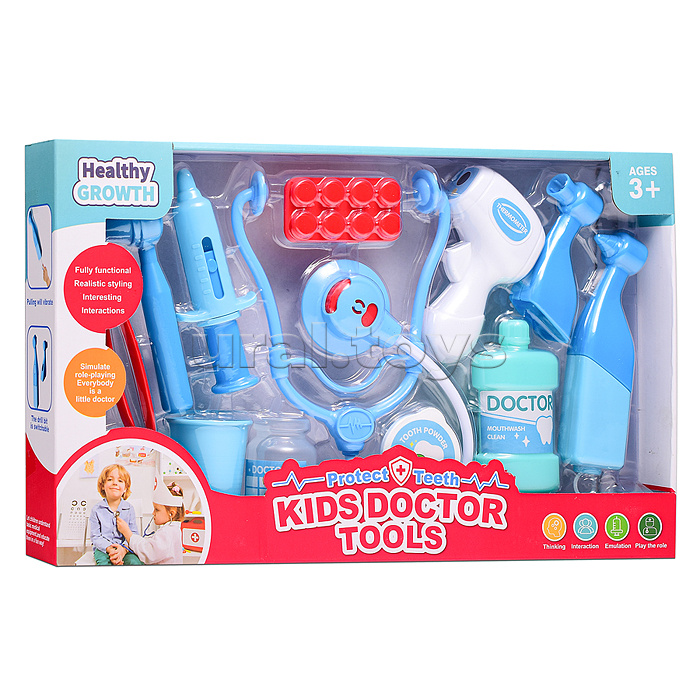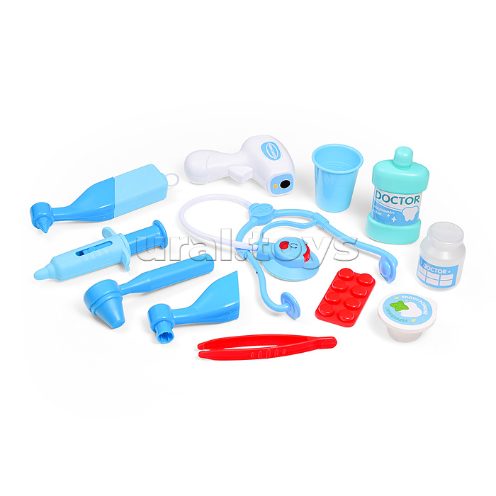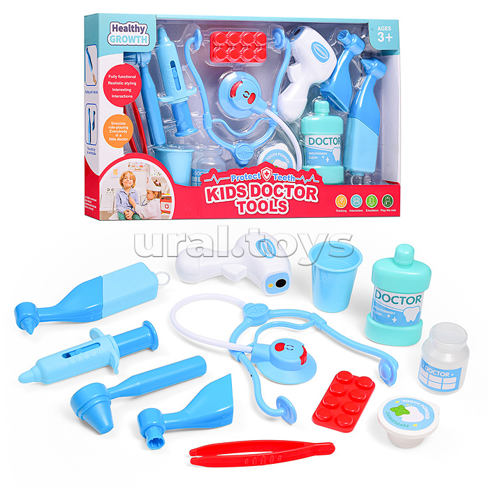 • В наборе: - стетоскоп. - термометр. - пинцет. - шприц. - стаканчик. - баночка. - муляж таблеток. • Материал: пластик. • Соответствует требованиям безопасности продукции. • Для детей от 3-х лет.