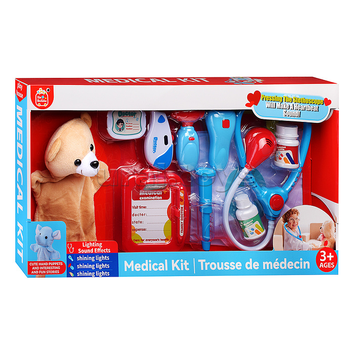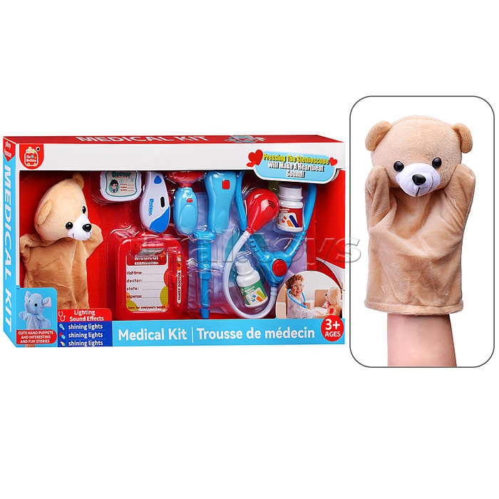 • В наборе: - игрушка-перчатка (16х7х19 см.) - шприц с пружинкой (12х4 см.) - отоскоп с подсветкой (10х5 см.) - термометр с подсветкой (10х4.5 см.) - стетоскоп (звук биения сердца, подсветка) - аксессуары. • Отоскоп работает от 2-х батареек "AG10" (входят в комплект) • Термометр работает от 2-х батареек "AG10" (входят в комплект) • Стетоскоп работает от 2-х батареек "AG10" (входят в комплект) • Материалы: пластик, текстиль. • Соответствует требованиям безопасности и качества продукции. • Для детей от 3-х лет.