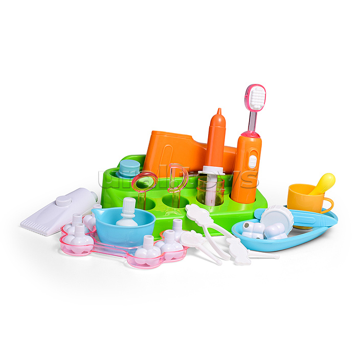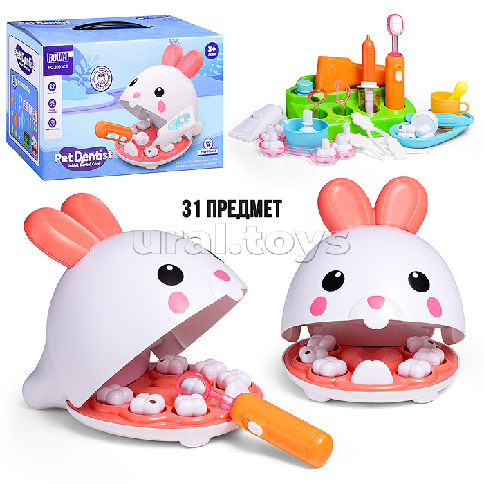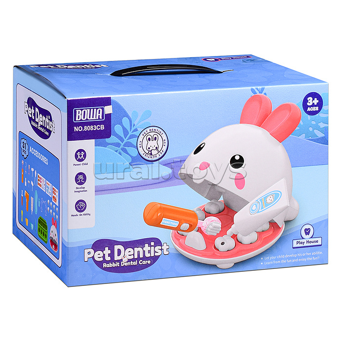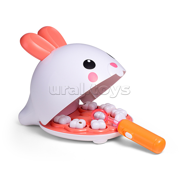 Код: 490905 Штрихкод: 6933115993162 Страна производитель: Китай Размеры упаковки: 26 x 15 x 16.5 см Количество в коробке: 12 • В наборе: - голова кролика (14.5х18х10 см.) - зубная щётка с подсветкой (12.5х2х2 см.) - инструменты стоматолога. • Свет работает от 2-х батареек "AG10" (входят в комплект). • Материал: пластик. • Соответствует требованиям безопасности продукции. • Для детей от 3-х лет. Комментарии к товару