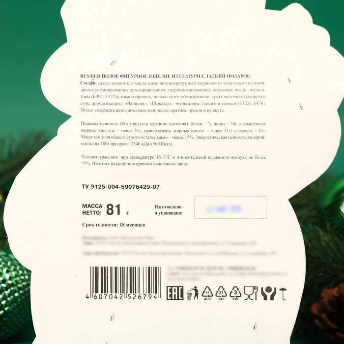 Кондитерская глазурь в яркой и красочной упаковке, в виде старой елочной игрушки - это необычный, оригинальный сладкий подарок, который дарит неповторимые эмоции! Вам больше не нужно ломать голову над идеей подарка, мы все придумали за Вас.