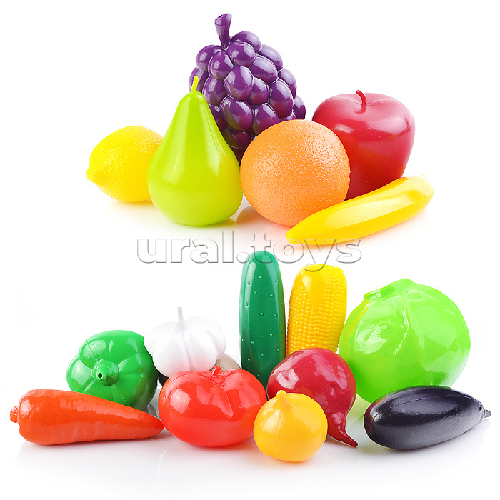 Код: 281467 Страна производитель: Россия Размеры упаковки: 31 x 31 x 21 см Количество в коробке: 10 • Комплектация: - виноград (8,5х6,5х15 см.), - лимон (5,5х6х8 см.), - апельсин (7,5х7,5х8 см.), - банан (3х3х17 см.), - груша (7х8х10 см.), - яблоко (8х8х8,5 см.), - огурец (4х4х13 см.), - перец (7х7,5х9 см.), - морковь (4,5х4,5х12 см.), - свекла (6,5х7х9 см.), - кукуруза (4,7х4,7х12 см.), - картофель (5,5х5,5х8 см.), - баклажан (4,5х4,5х13 см.), - помидор (8,5х7,5х6 см.), - капуста (10,5х11х11 см.), - лук (5,5х5,5х6 см.), - чеснок (7х7х6 см.). • Материал: пластмасса. • Соответствует требованиям безопасности продукции. • Для детей от 1,5 лет. Комментарии к товару