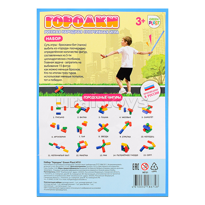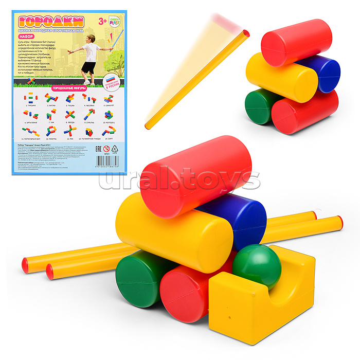 Код: 481325 Страна производитель: Россия Размеры упаковки: 50 x 18 x 8 см Количество в коробке: 20 • В наборе: - 5 цилиндров (8х8х16 см.) - арка (15.5х8х8 см.) - шар (7х7х7 см.) - 2 биты (53х2.5х2.5 см.) • Материал: пластик. • Соответствует требованиям безопасности и стандартам качества продукции. • Для детей от 3-х лет. Комментарии к товару