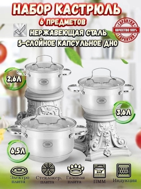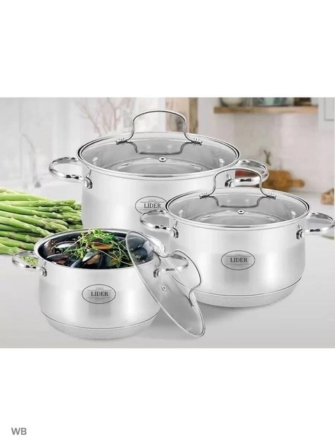 Набор посуды LIDER LD 2006 6 предметов, из нержавеющей стали (3 КАСТРЮЛИ С КРЫШКАМИ: 2.6 Л (18*10.5), 3.6 Л (20*11.5см), 6,5 (24*14,5 см ),
