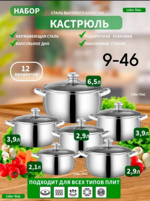 Набор кастрюль LIDER LD 2004 12 предметов из нержавеющей стали Размеры : (16*10,5) 2.1л (18*11.5) 2,9л (18*11.5) 2,9л (20*12.5) 3,9л (20*12.5) 3,9л (