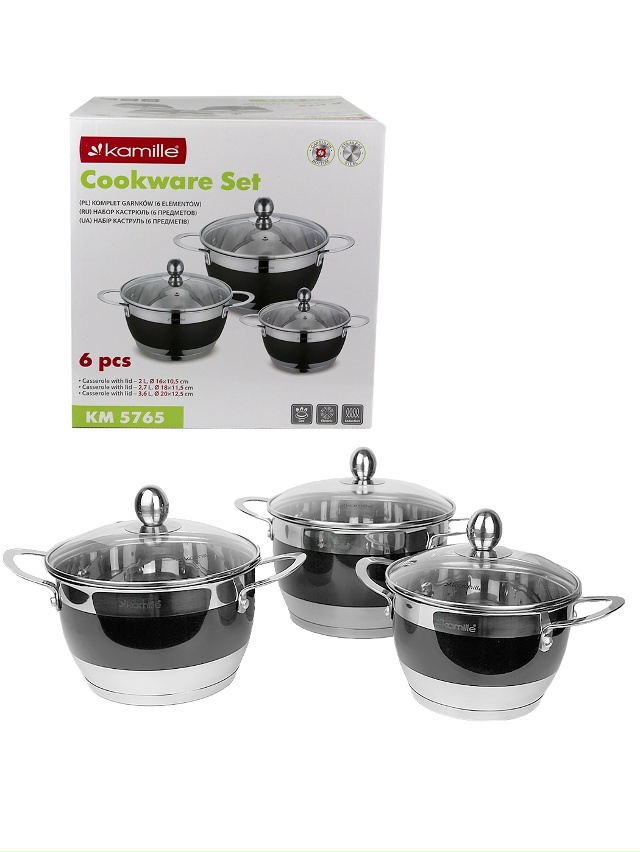 Набор кастрюль 6 предметов 2 л; 2,7 л; 3,6 л. Kamille KM 5765 из нержавеющей стали.