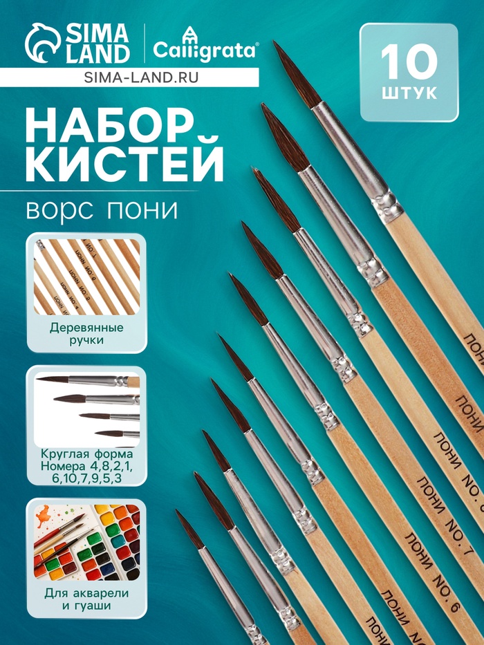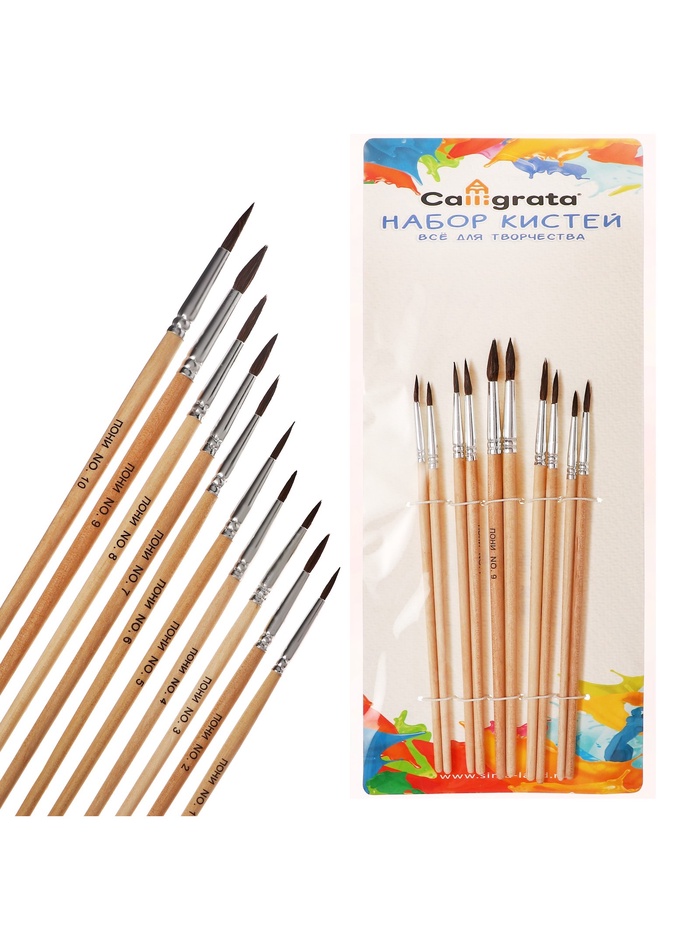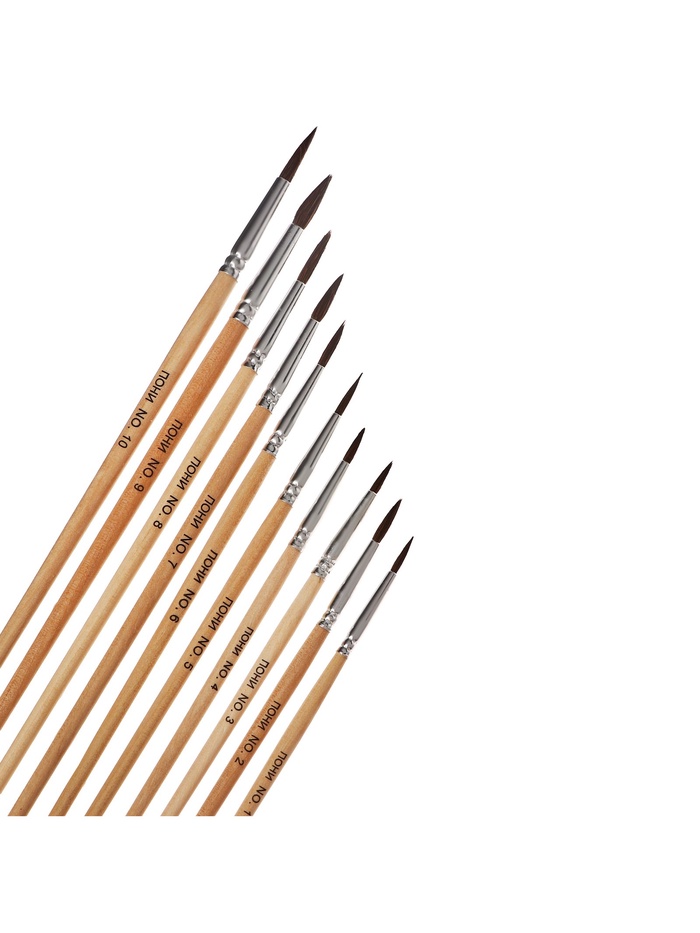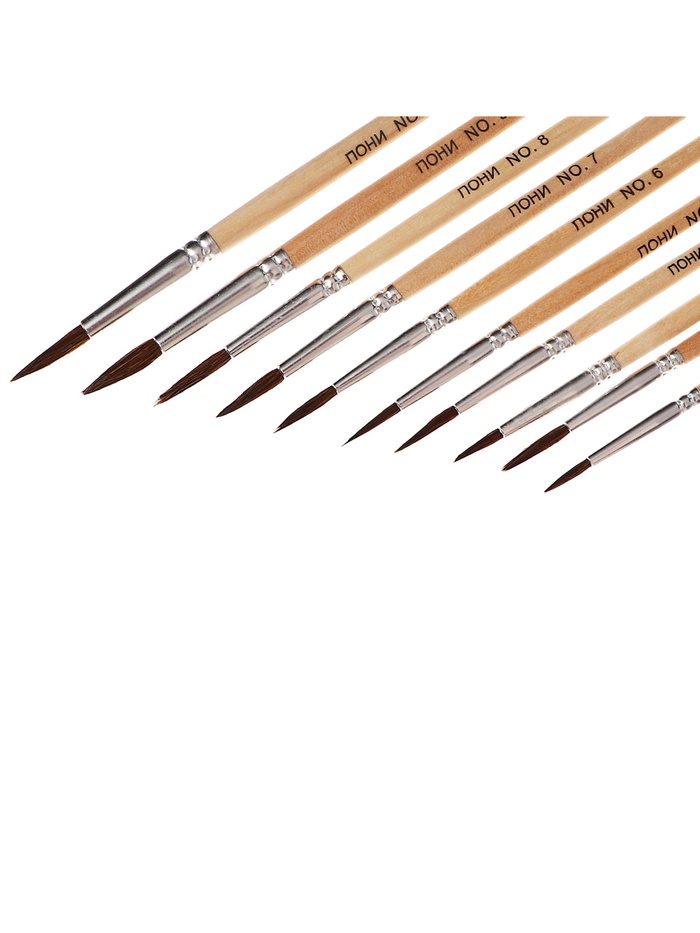 Создавайте многослойные работы с полным набором из десяти круглых кистей из пони. В комплекте собраны размеры от №1 до №10 — от тонких контуров до масштабных фоновых заливок.