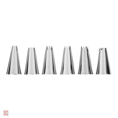 Насадки VETTA используются для фигурного нанесения крема из кондитерского мешка на торты и капкейки, а также любые другие десерты. Предназначены для создания декоративных элементов с мелким рифлением. С их помощью вы сможете украсить свое кондитерское изделие звездами, ракушками, рифленым бордюром и т.п. Также используется при работе с тестом. В наборе 6 насадок из нержавеющей стали.