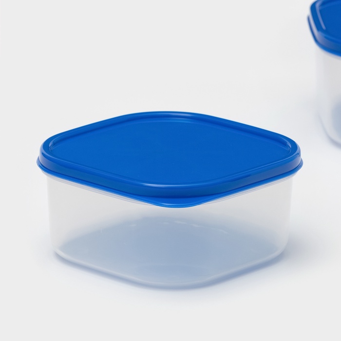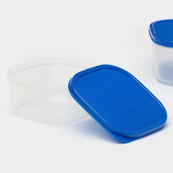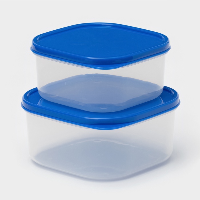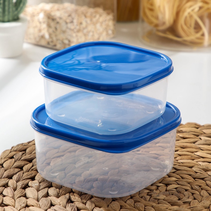 Набор из двух квадратных контейнеров — 450 мл и 700 мл — для тех, кто готовит с расчётом: один — на перекус, второй — на основной приём пищи. Прозрачные стенки показывают содержимое, синяя крышка помогает отличить размеры без вскрытия.