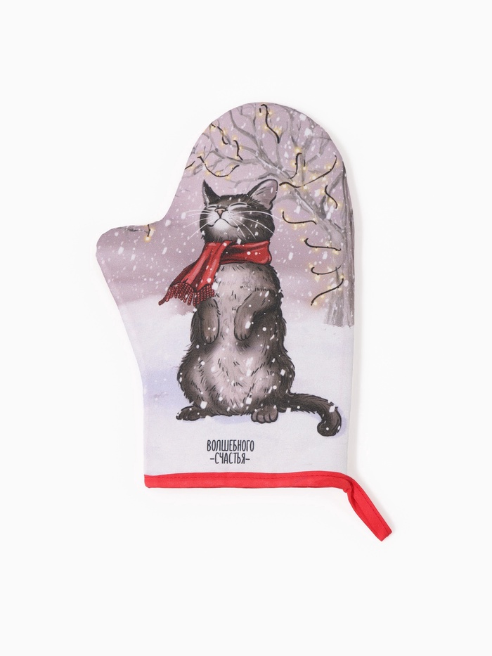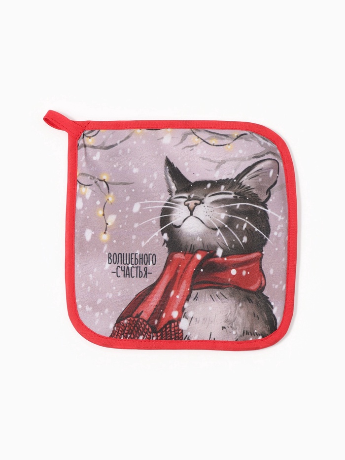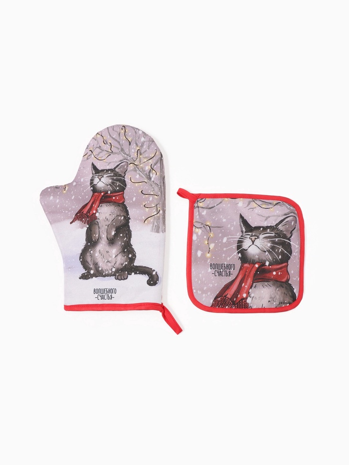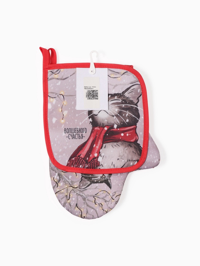 Набор «Волшебного счастья» — небольшой, но тёплый жест заботы для новогодней кухни. Две прихватки: квадратная и в виде варежки — с рисунками, которые не кричат о празднике, а как бы напоминают: “Он уже близко”. Бежевый фон с акцентами красного и сюжетами из мира животных — ни снеговиков, ни колокольчиков, но уют, который узнаётся с первого взгляда.