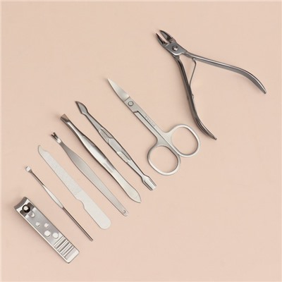 Составляющие набора: Пилка, Пушер, Ухочистка, Кусачки, Ножницы, Триммер, Книпсер, Пинцет