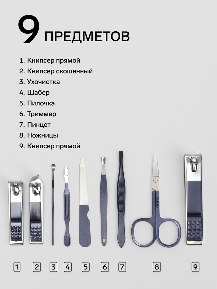Почему этот набор удобен Инструменты из прочного металла не гнутся и долго остаются острыми. Футляр сохраняет порядок: после использования всё легко убрать на место. Синий цвет кейса выглядит стильно и не маркий. Для кого Набор пригодится тем, кто делает маникюр дома или берёт инструменты с собой в поездки. Универсальный состав подходит для обработки ногтей, кутикулы и кожи. Такой комплект — практичный подарок на любой праздник. КомплектацияВ наборе: