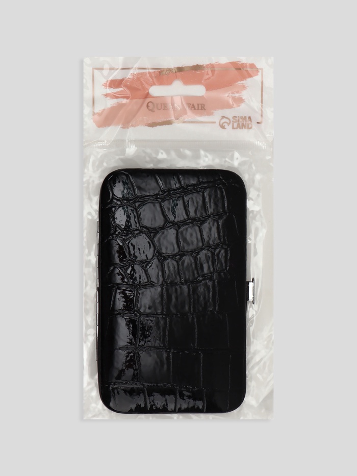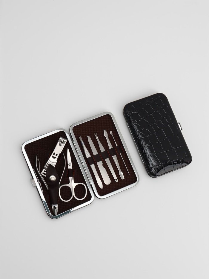 Универсальный чёрный маникюрный набор в стильном футляре — практичный выбор для ухода за руками и ногами. Восьмикомпонентный комплект подходит как мужчинам, так и женщинам, обеспечивая точность и комфорт в повседневном использовании. Искусственная кожа обложки и надёжная защёлка делают его удобным для хранения и переноски.
