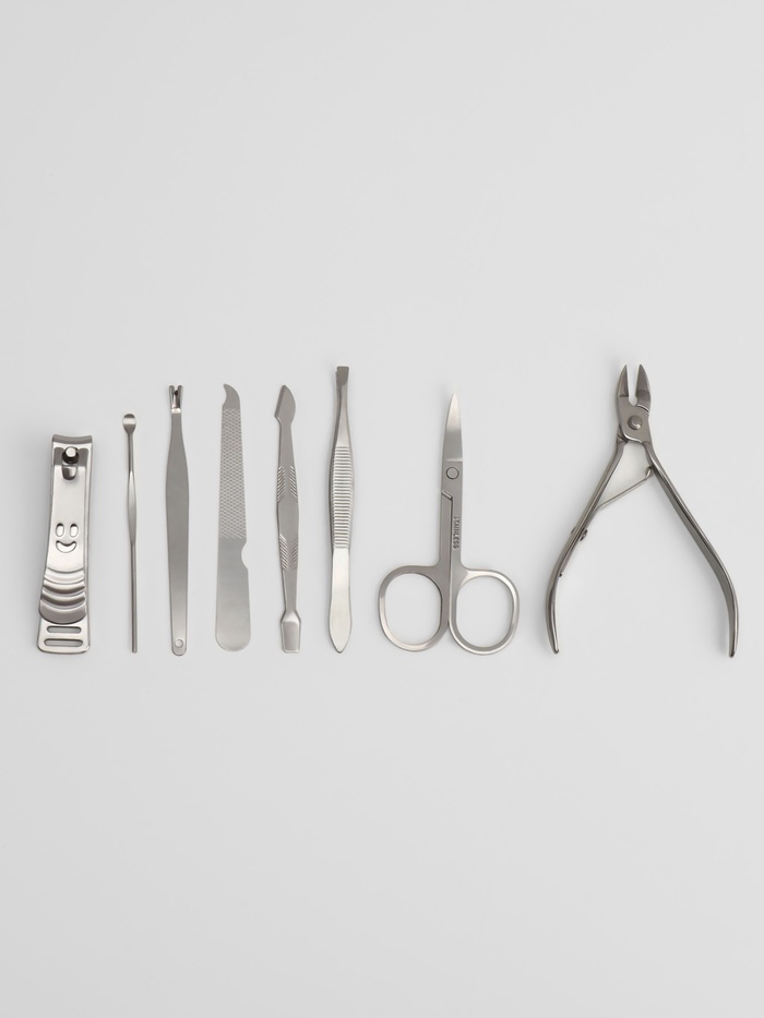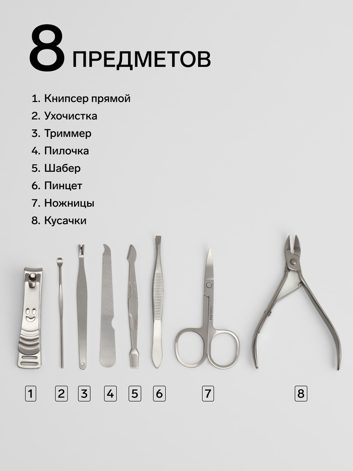 Составляющие набора: Книпсер, Шабер, Пинцет, Пилка, Кусачки, Ножницы, Триммер, Ухочистка