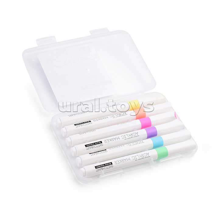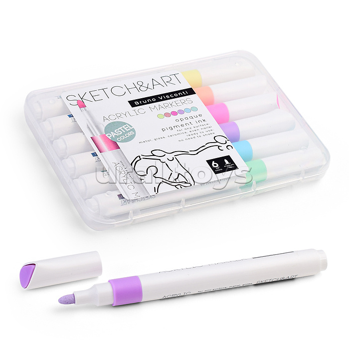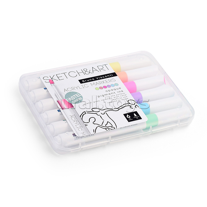 Набор из 6 акриловых маркеров «SKETCH&ART» в пастельных цветах для рисования, декорирования, дизайнерских работ на любых поверхностях: холст, бумага, дерево, пластик, металл, камень, стекло, одежда, керамика. Корпус маркеров изготовлен из полипропилена - он легкий и ударопрочный. Плотно защелкивающийся колпачок обеспечивает долгую сохранность чернил от высыхания. Маркер имеет пулевидный наконечник из износостойкого волокна с шириной линии 1-3 мм. Нетоксичные пигментные чернила на водной основе с высокой степенью укрывистости быстро сохнут на поверхности, оставляя яркий след. Краски до высыхания можно смешать или растушевать кистью для достижения плавных переходов.