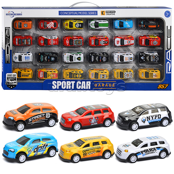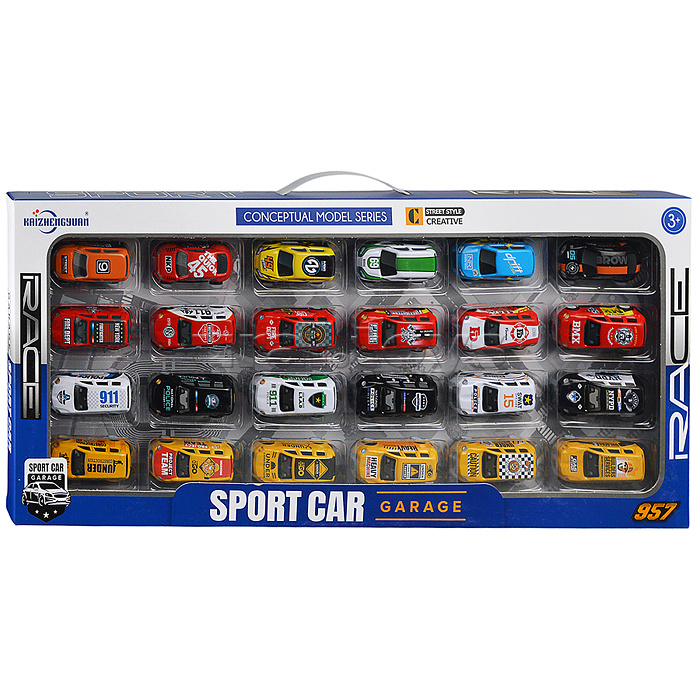 В наборе 24 машинки. Размер: 8 см. Механизм: инерционный. Изготовлено из полимерных материалов. Соответствует требованиям безопасности продукции. Для детей от 3 лет.