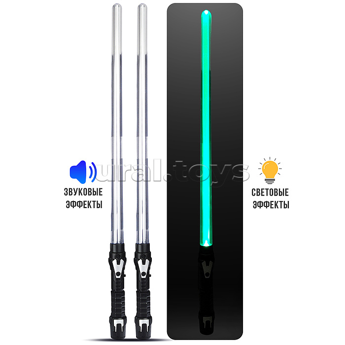 • В наборе 2 меча. • Размеры меча: 4х4х72.5 см. • Функции меча: - свет лезвия. - звук удара меча (при взмахе). • Один меч работает от 3-х батареек "ААА" (не входят в комплект). • Мечи можно объединить в копьё. • Длина копья: 145 см. • Материал: пластик. • Соответствует требованиям безопасности и стандартам качества продукции. • Для детей от 3-х лет.