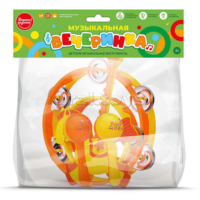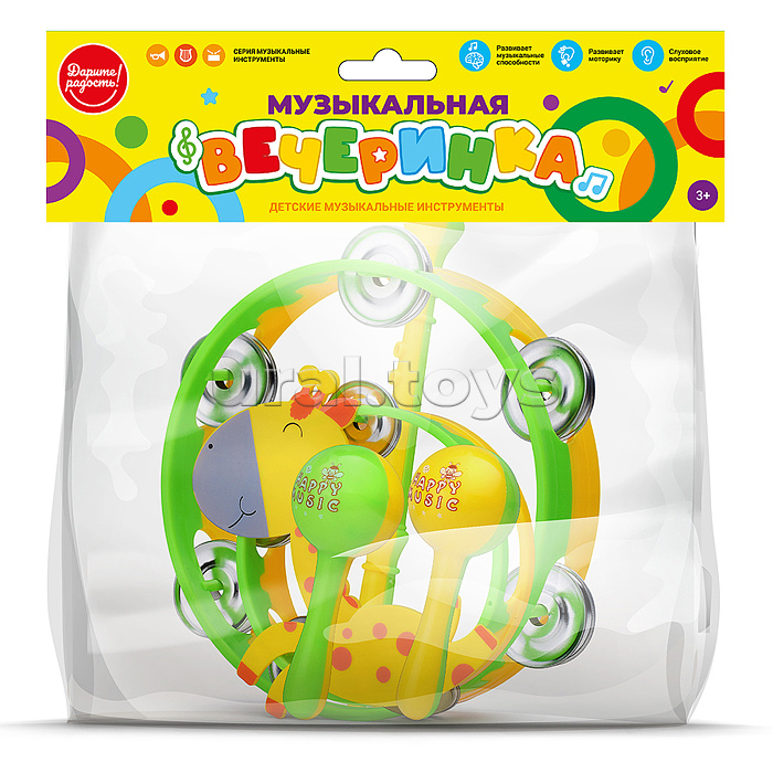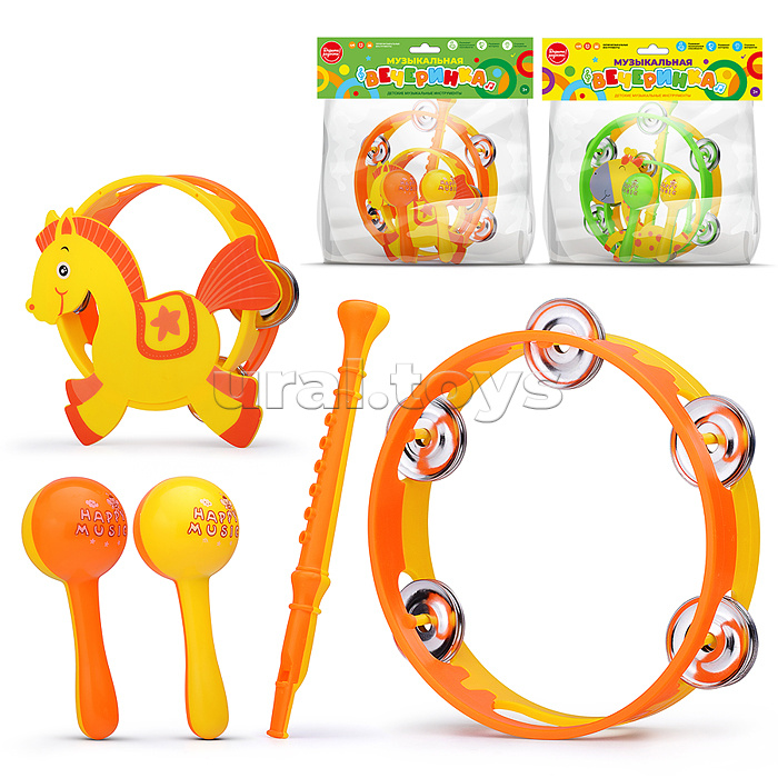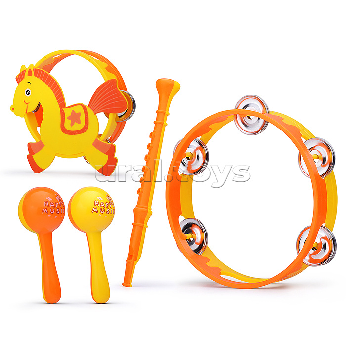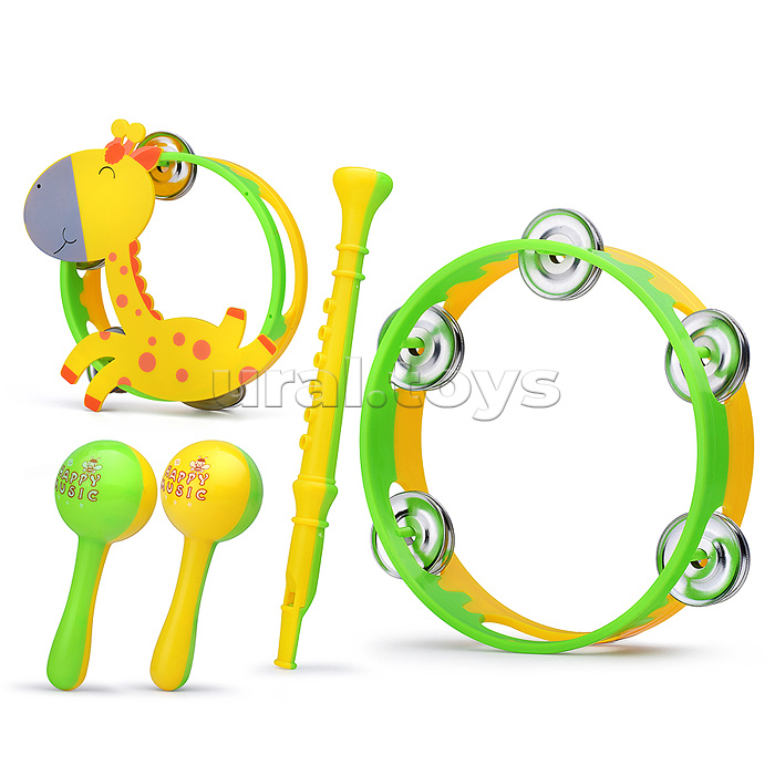 • В наборе: - бубен с металлическими бубенцами (14.5х14.5х3.5 см.) - бубен с металлическими бубенцами (12х12х4.5 см.) - 2 маракаса (12х4.5х4.5 см.) - дудка (25 см.) • Материал: пластик. • Соответствует требованиям безопасности продукции. • Для детей от 3-х лет.